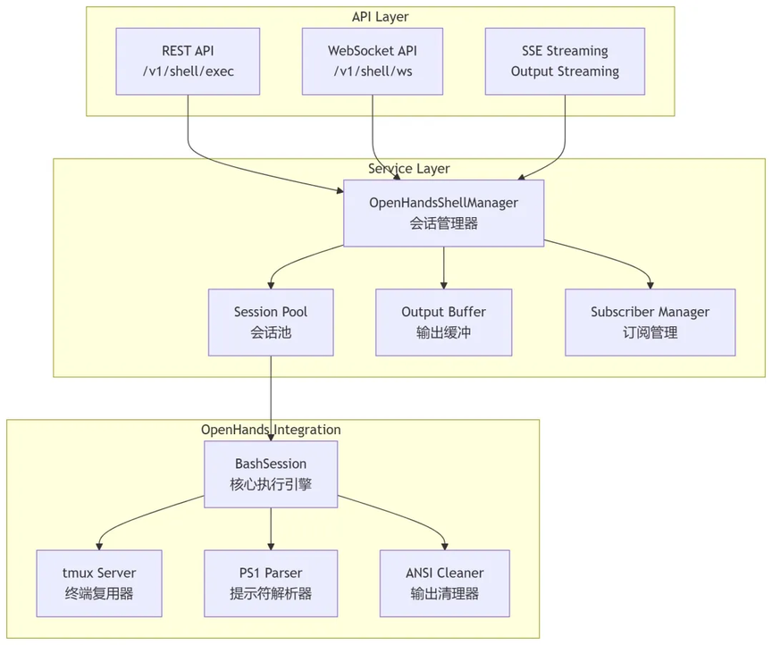 对于 Coding Agent,大部分任务都可以通过命令行执行完成。设计 Shell 模块时,以 OpenHands 的 CmdRunAction (见文末参考 2)为执行引擎,配合 tmux,实现多会话(multi-session)执行能力。