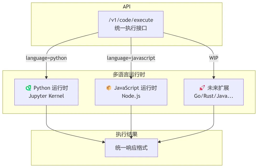 综合权衡语言覆盖与镜像体积,使用 Sandbox Fusion(见文末参考 4) 里的 Python 3.10/3.11/3.12 与 Node.js 22 运行时,并为代码执行提供一体化的安全隔离环境。