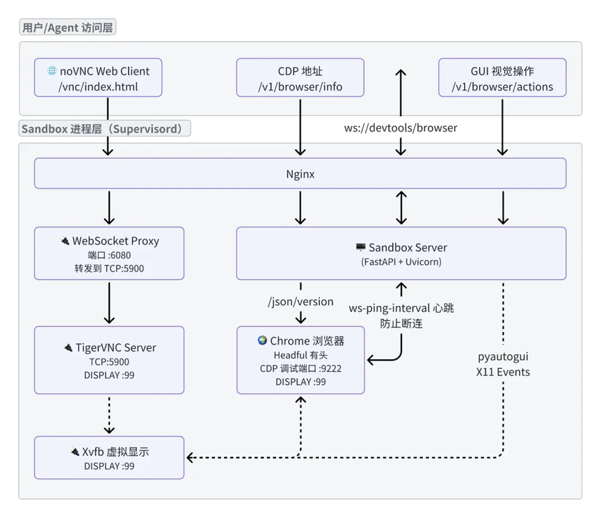 注:AIO Sandbox 不直接暴露 CDP 接口 /json/version,而是通过 uvicorn 服务中转 CDP 并增加了心跳检测,避免出现 ws 断连问题。