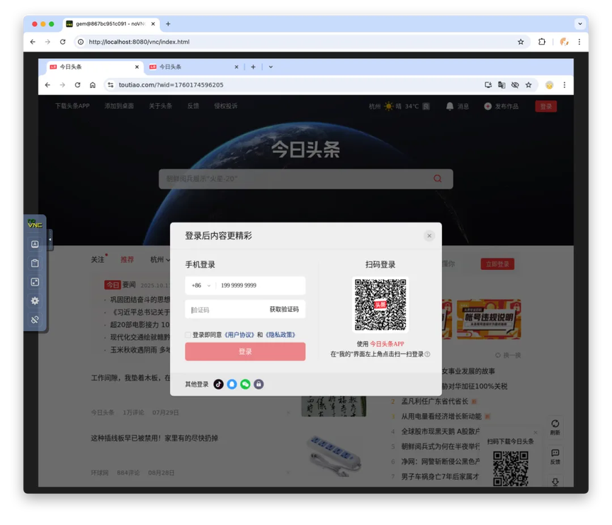 当 Browser Use 遇到要登录的情况,一般需要人工接管,需要提供可交互的浏览器界面,目前有两种做法: