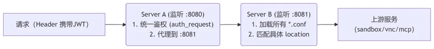 Agent 在沙箱里会产生用户数据,为了在不侵入、不修改任何既有业务路由配置、同时不增加未来扩展的路由配置的心智负担的前提下,实现 AIO Sandbox 全局统一鉴权,在内部 Nginx 网关层设计了“非对称加密+JWT”反向代理架构来实现鉴权: