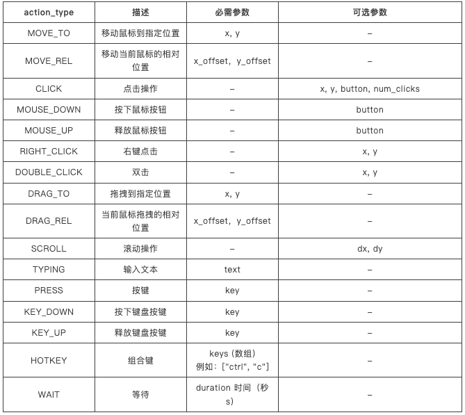 将 GUI 操作抽象为可组合的最小原子动作,如移动鼠标、点击、拖动、滚动、按键、输入文本,以及额外的工具函数如等待,尽可能对齐 VLM 视觉模型在执行实际动作的一致性。