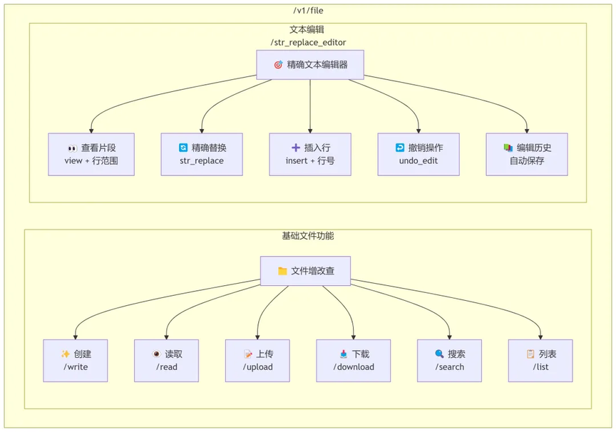 文件增改查:封装文件读取/写入/列目录/新建/上传/下载等基础 I/O,配合路径校验与权限控制,覆盖通用文件操作场景。