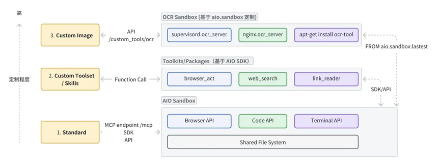 Custom Image(定制镜像):基于 FROM aio.sandbox 基础镜像,安装特定的基础依赖(如多媒体/图像处理等),挂载自定义服务(例如 /custom_tools/ocr 图像识别)。