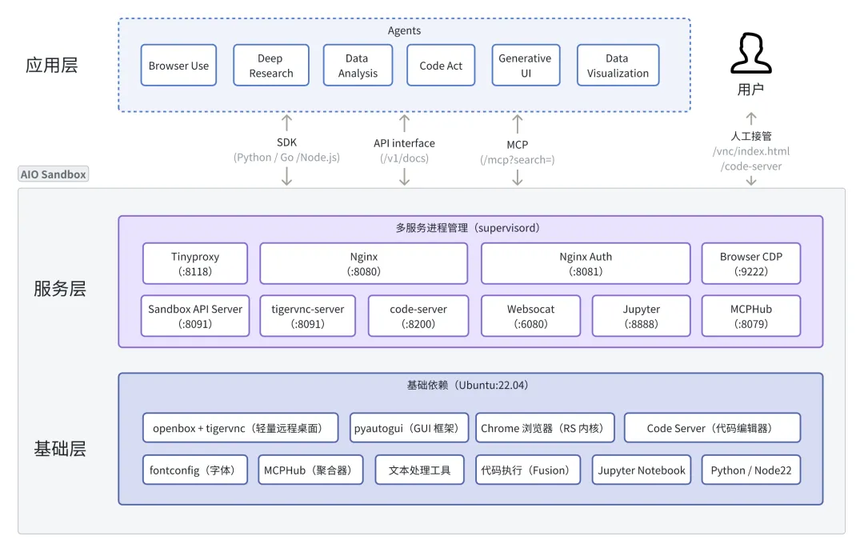 一句话介绍:AIO Sandbox 在一个沙盒内集成浏览器、代码执行、终端、可视化接管、正反向代理、MCP、鉴权等基础功能,可根据需求进行沙盒环境定制,让不同的 Agent“在一个环境容器内中更高效地完成任务”。
