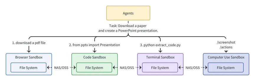 🧩 环境割裂:多个单功能沙盒(如 E2B 支持代码执行,Browserbase 支持浏览器)迫使 Agent 通过 NAS/OSS 跨沙箱传输数据,增加延迟与复杂度。如:深度研究 Agent 完成『将一篇论文 Paper 做成 PPT』需在多沙箱间交换数十个中间文件(JSON 配置、图表图片、预览截图等),增加整个 Agent 系统复杂度和开销。
