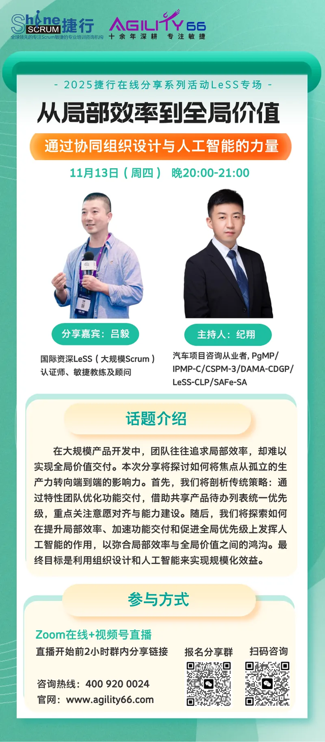 国际 Scrum 联盟认证导师 CST、CAL Educator、Agile PMO Trainer、Babson 创业学家 MBA。著有《Scrum 实践精萃》和《敏捷教练成长手记》。