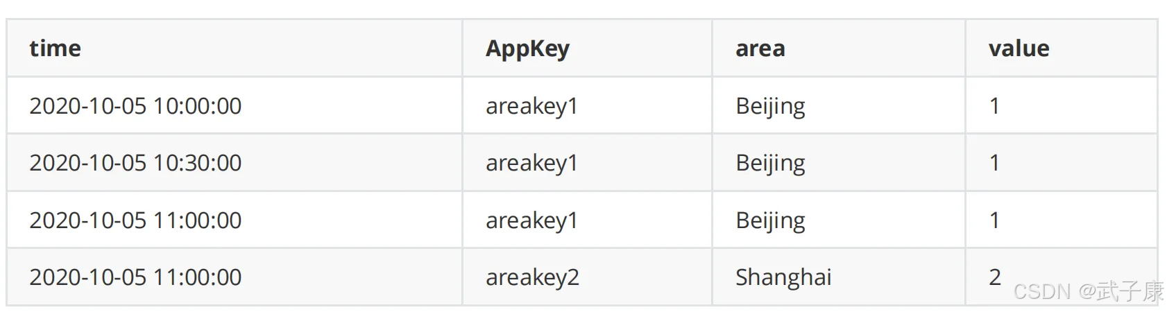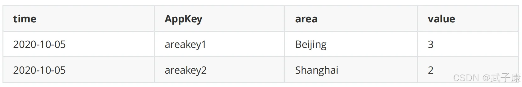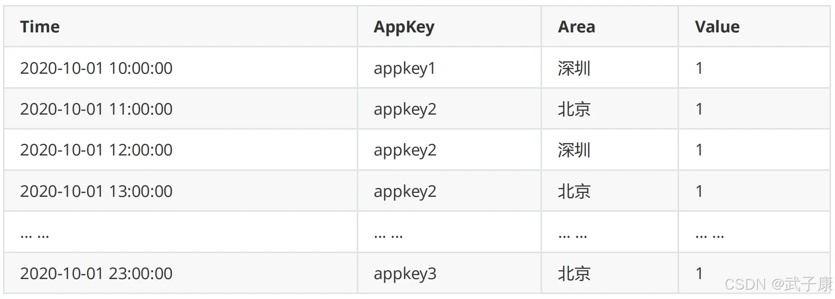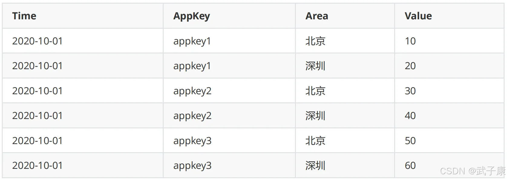 第一列为时间,Appkey 和 Area 都是维度列,Value 为指标列