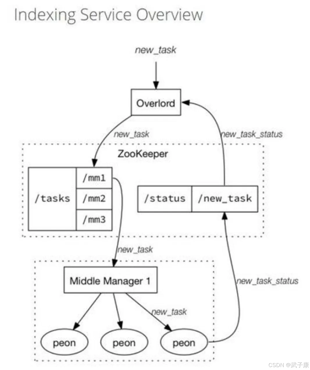 负责创建 Task、分发 Task 到 MiddleManger 上运行,为 Task 创建锁以及跟踪 Task 运行状态并反馈给用户