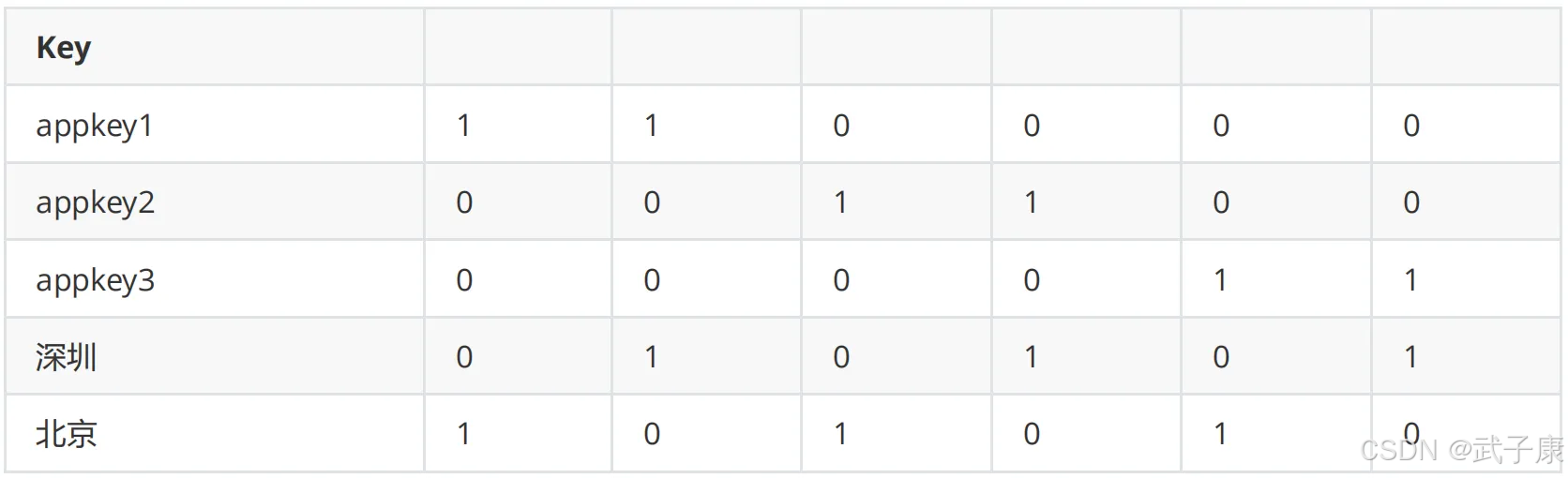 Druid 通过建立位图索引,实现快速数据查找。BitMap 索引主要为了加速查询时有条件过滤的场景,Druid 生成索引文件的时候,对每个列的每个取值生成对应的 BitMap 集合: