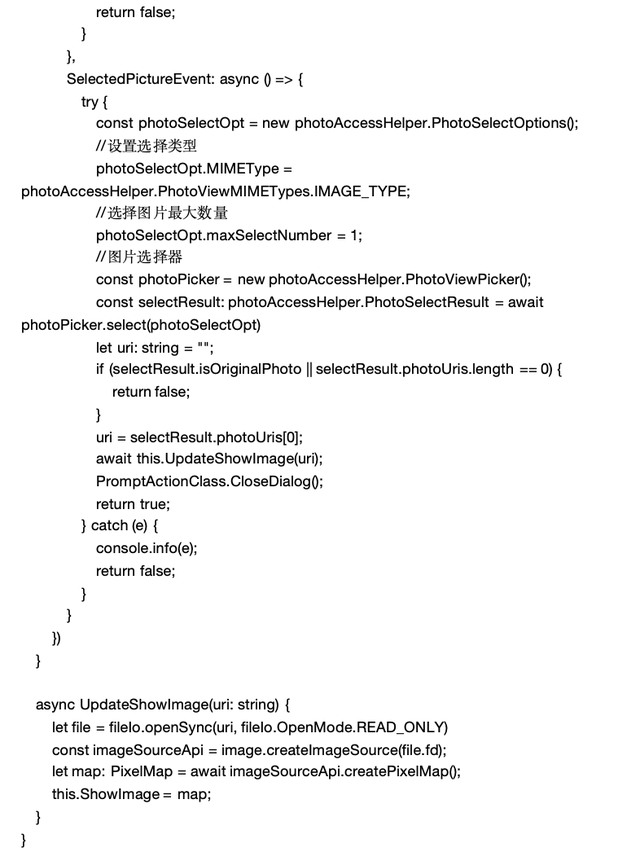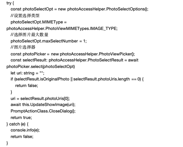 · 使用 photoAccessHelper.PhotoViewPicker 对象的 select 方法,实现安全调用相册并选择图片。通过 photoAccessHelper.PhotoSelectOptions 对象,对选择方法进行初始化,可以设置默认选择、选择数量、选择类型等。