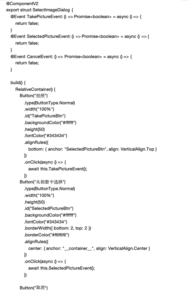 封装一个选择图片和调用拍照相机的按钮,展示 api13 下选择图片和调用相机,可以使用不申请用户权限的方式,进行图片的选择和修改。但是,目前方案并未包含上传图片保存的功能,仅提供图片选择或者拍照后,图片展示的一种方案。