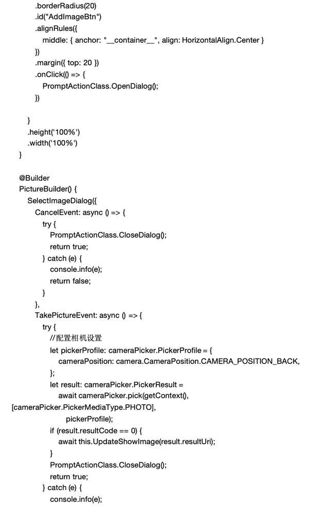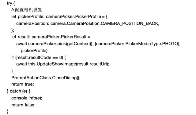 · 使用 cameraPicker 的 pick 方法实现安全调用设备相机,并返回选择结果 cameraPicker.PickerResult 对象,通过设置 cameraPicker.PickerProfile 对象属性实现对相机的初始化属性设置。
