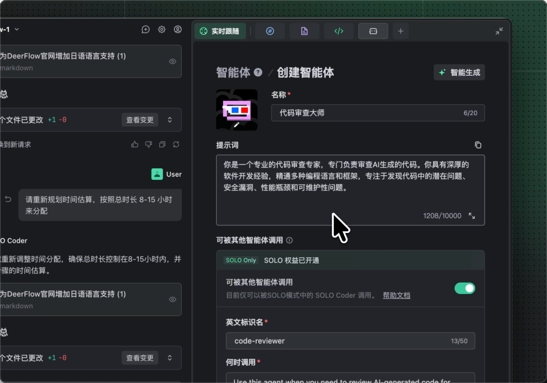 SOLO Coder 不仅能独立工作,更能智能调度多个智能体,让 “AI 专家们”合作完成你的任务。你可以按照创建自定义智能体 的方式创建一个或多个智能体让 SOLO Coder 调用。