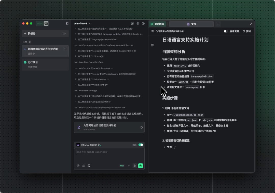 SOLO Coder 支持 Plan 模式,擅长项目迭代、问题修复与架构重构,让你在开发过程中更有掌控感。