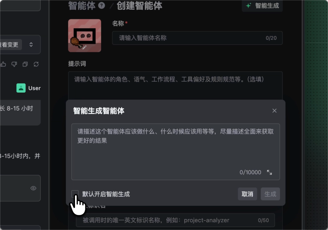 智能创建: 新增智能创建功能,当你输入对智能体的简短描述,模型会根据描述生成完整的智能体内容。