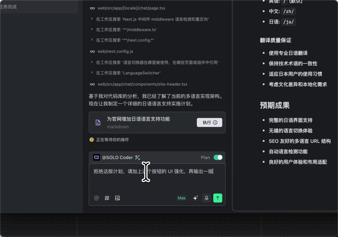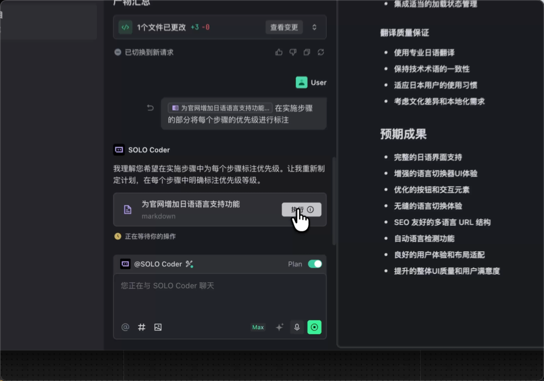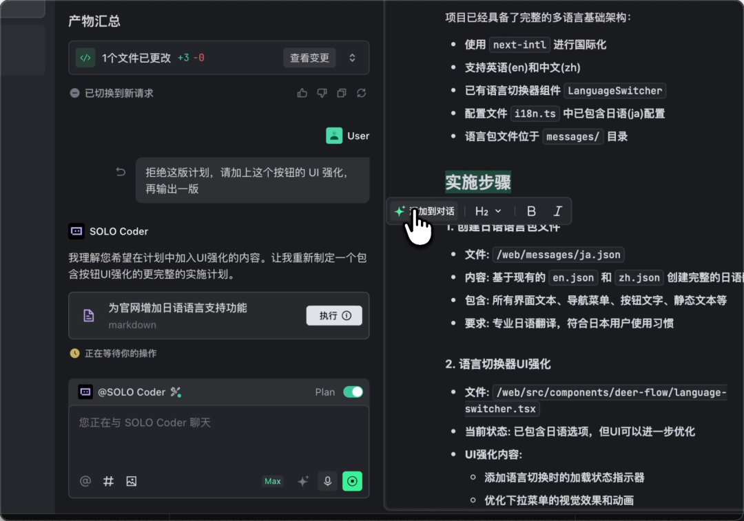 生成计划: 你可以在使用 @SOLO Coder 时,在对话框上方打开 Plan ,发送请求后 AI 将首先输出一份开发计划呈现在文档窗口。