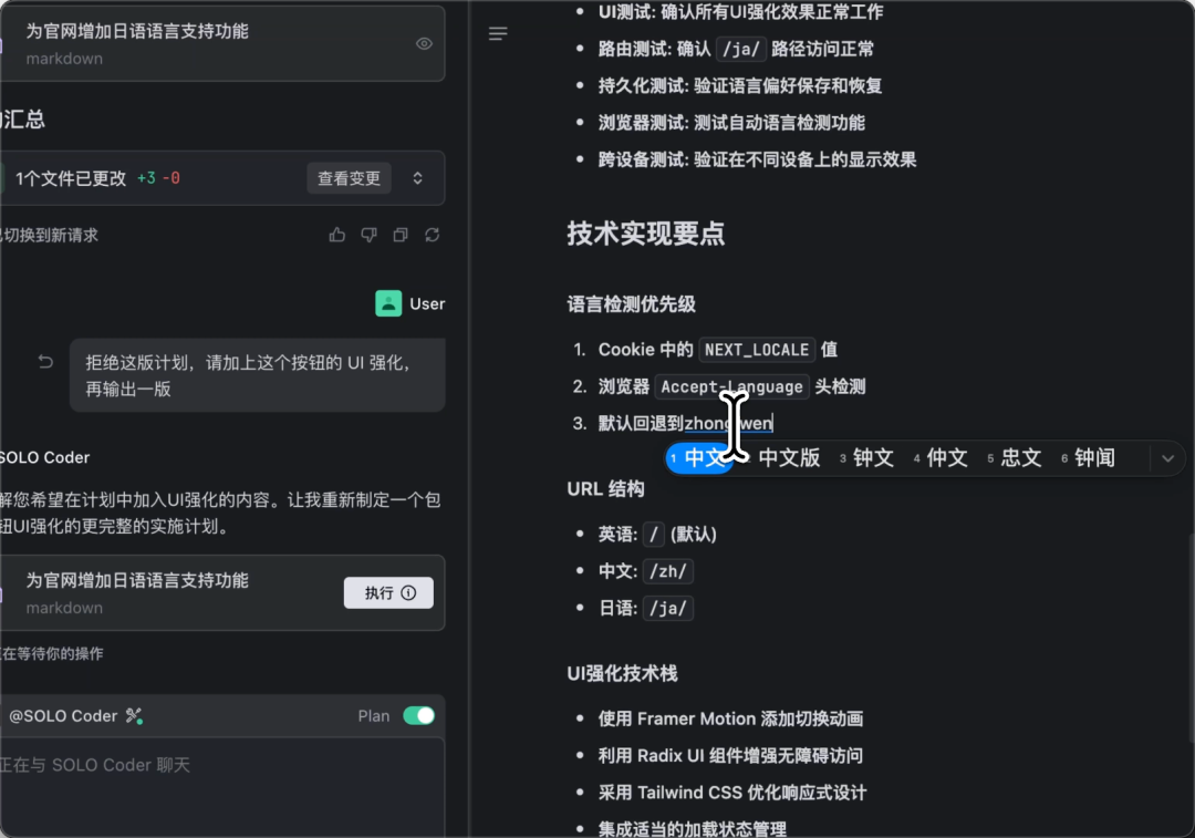 确认执行: 只有当你对方案满后,点击计划卡片上的 “执行” 按钮,AI 才会按照最终确认的方案进行开发。无论是新功能开发还是问题修复,都可以先让它生成计划,确保执行步骤符合预期,把控 AI 的执行步骤。