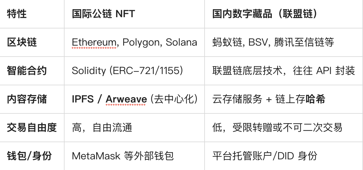 主流公链模式 (国际化/Web3):链: 以太坊 (Ethereum)、Polygon、Solana、Flow 等。特点: 去中心化、全球流通、可自由交易。标准: 使用标准的 ERC-721/ERC-1155。