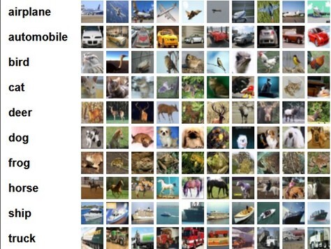 cifar 数据集共有 60000 张彩色图像,这些图像是 32*32,分为 10 个类,每类 6000 张图。有 50000 张用于训练,构成了 5 个训练批,每一批 10000 张图;另外 10000 用于测试,单独构成一批。测试批的数据里,取自 10 类中的每一类,每一类随机取 1000 张。抽剩下的就随机排列组成了训练批。注意一个训练批中的各类图像并不一定数量相同,总的来看训练批,每一类都有 5000 张图。