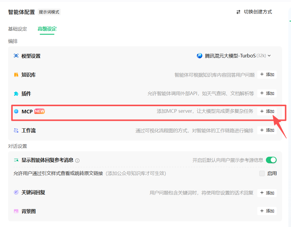 由于这里我们需要用到的腾讯混元生图 MCP Server 在当前的腾讯元器 MCP 商店中并没有,因此我们需要先添加腾讯混元生图 MCP Server。