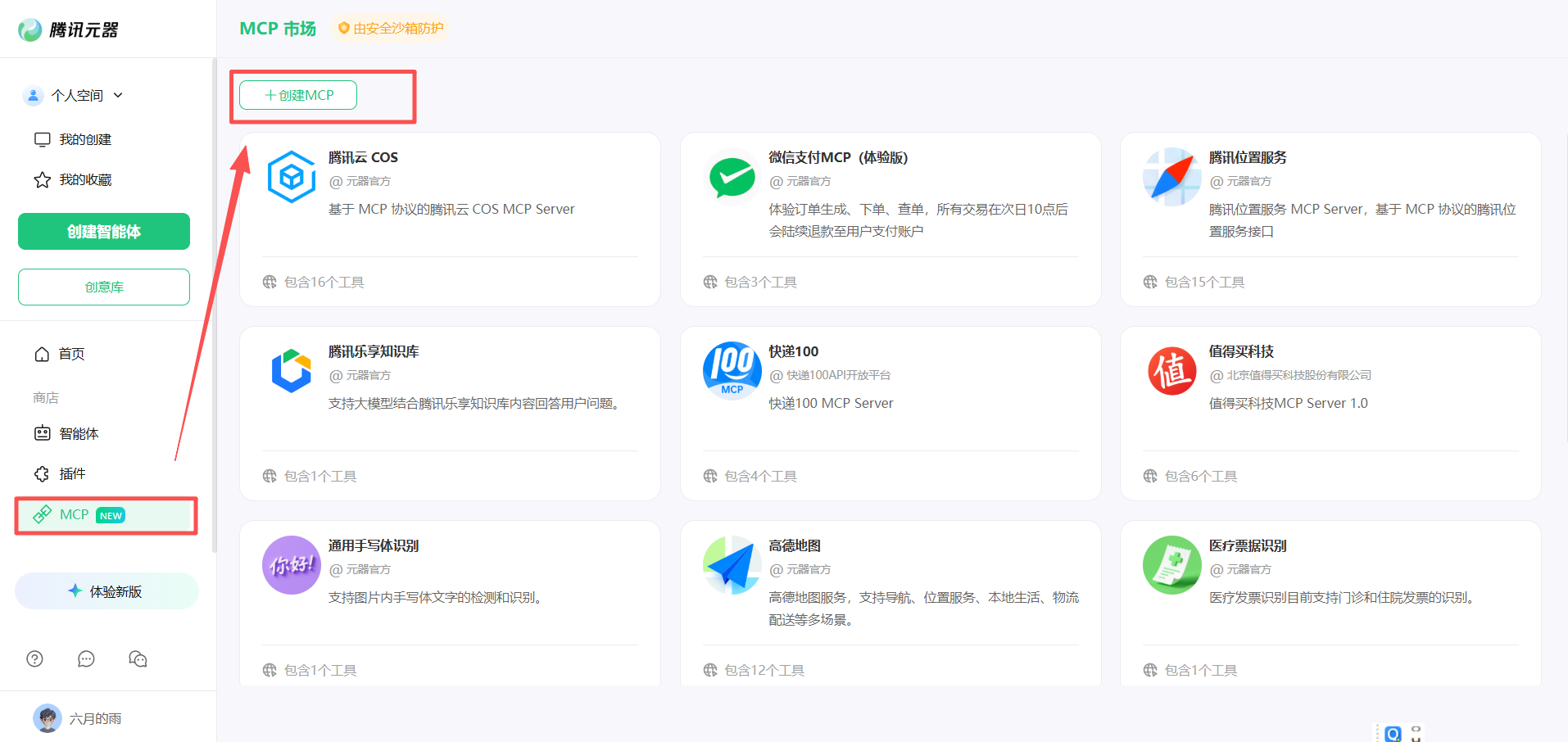 在腾讯元器控制台首页,我们选择左侧菜单【MCP】,在 MCP 商店页面选择【创建 MCP】