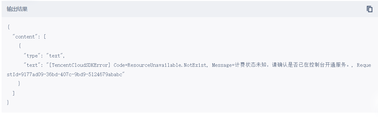 点击下面的【已完成连接,点击立即测试】就可以测试我们的腾讯混元生图 MCP Server 的连接情况了。执行在线测试,如果返回结果如下,则说明还未开通