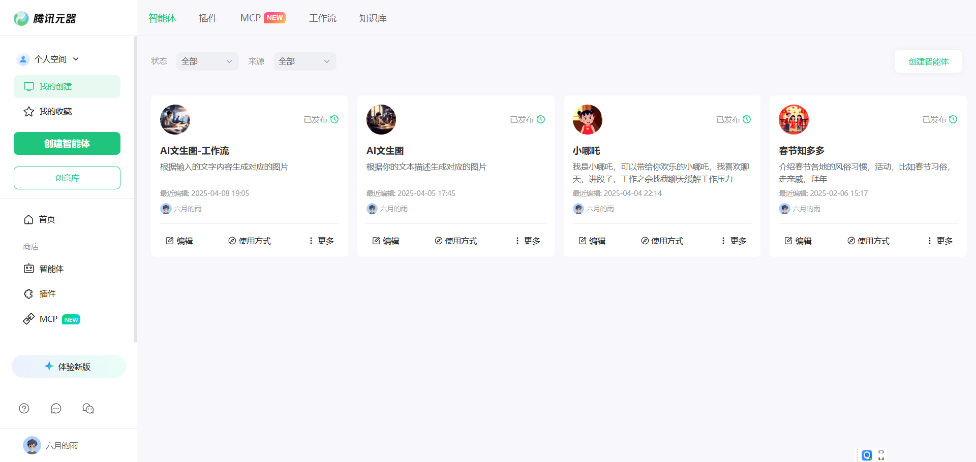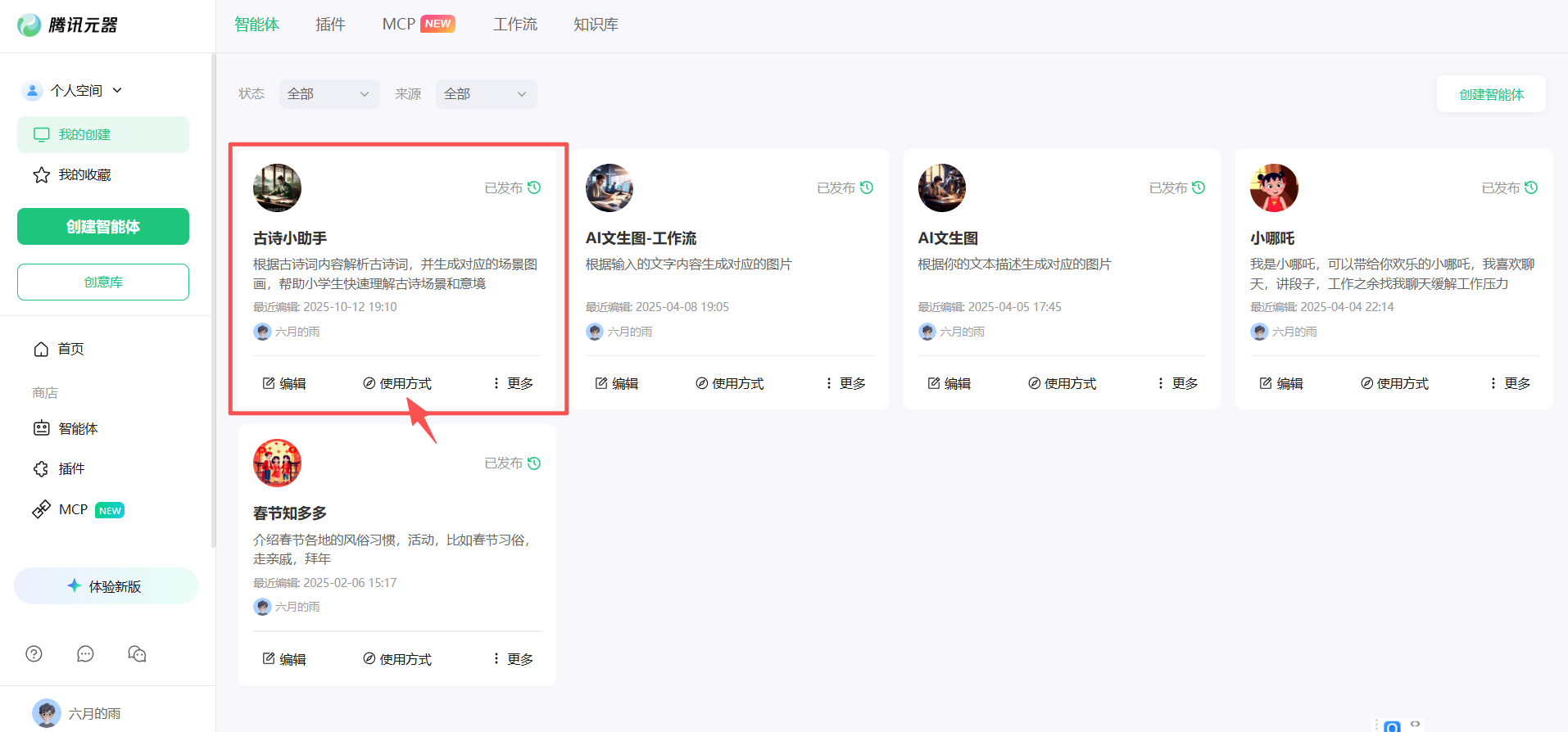在介绍了我们需要用到的腾讯混元生图服务以及腾讯混元生图 MCP 之后,下面我们就可以来创建我们的古诗学习小助手了。这里我们需要用到腾讯元器平台,腾讯元器地址:https://yuanqi.tencent.com/my-creation/agent
