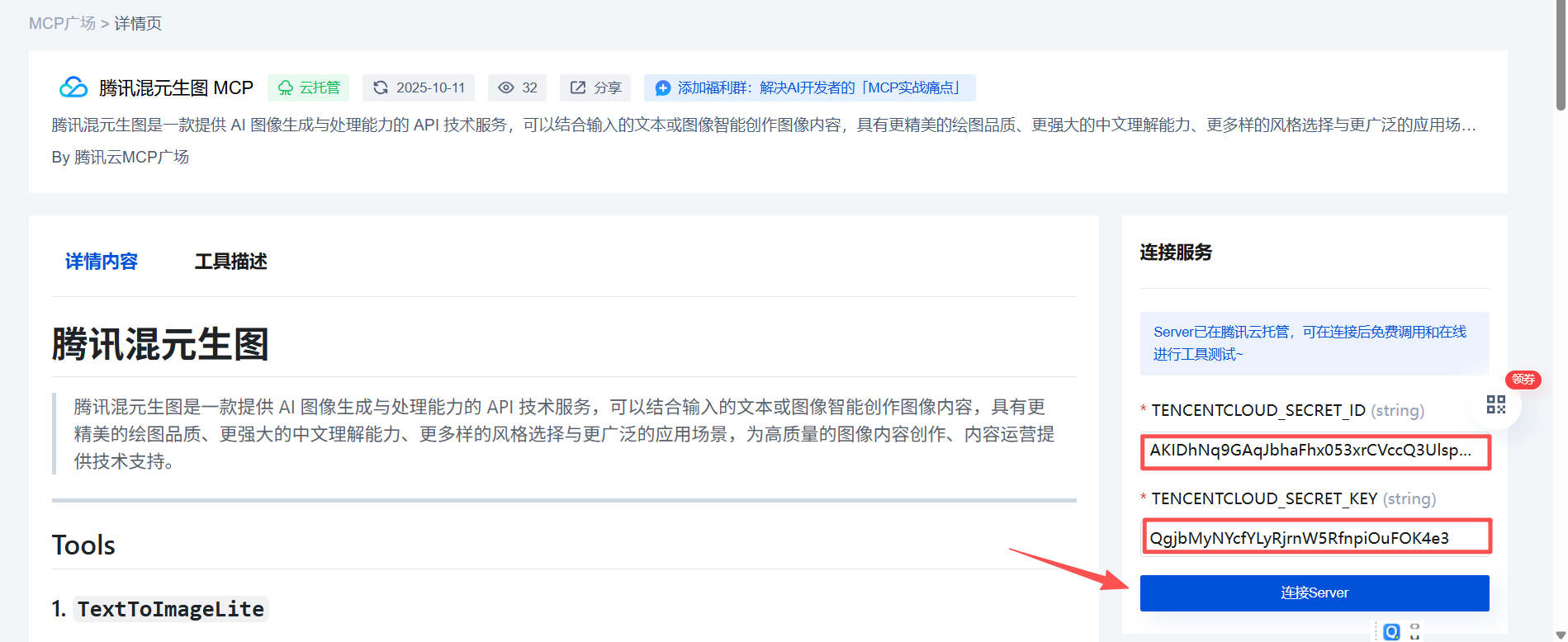 在腾讯混元生图 MCP 连接服务配置操作粘贴刚才获取的腾讯云 SecretId 和 SecretKey,点击【连接 Server】