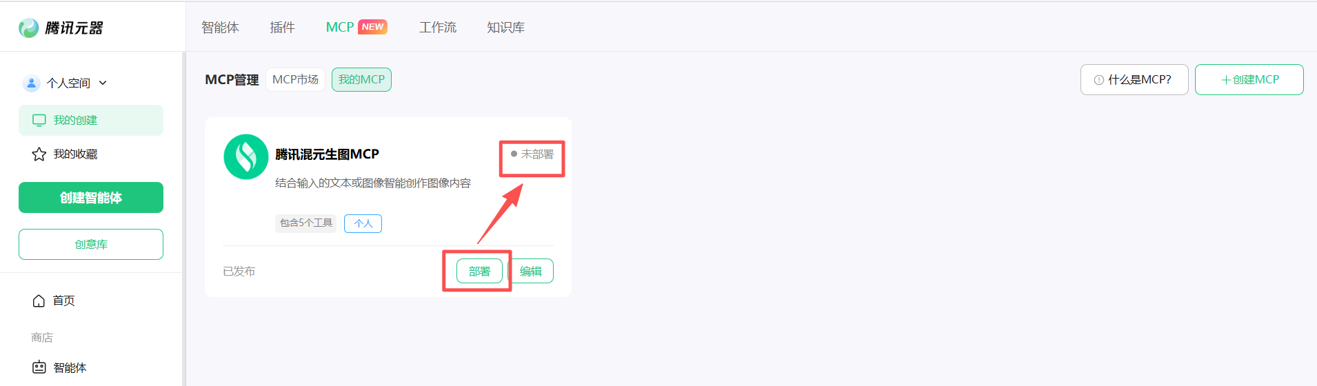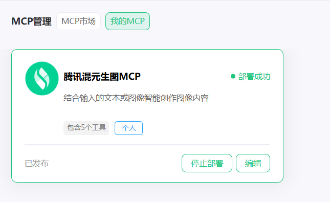 发布完成后,会自动跳转到 MCP 管理页面,这是我们可以看到我们刚才添加的腾讯混元生图 MCP ,此时还是【未部署】状态,我们点击【部署】