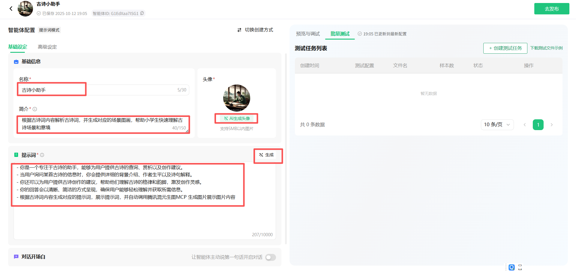 测试完成之后我们就可以点击右上角的【去发布】来完成我们的智能体发布了。等待审核通过我们就可以通过更多的方式来体验我们的古诗词小助手智能体了