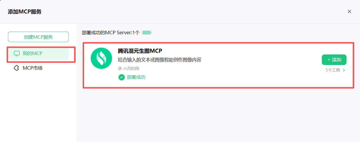 在添加 MCP 服务弹框页面选择【我的 MCP】,选择我们刚才配置并部署成功的【腾讯混元生图 MCP】,点击【添加】按钮