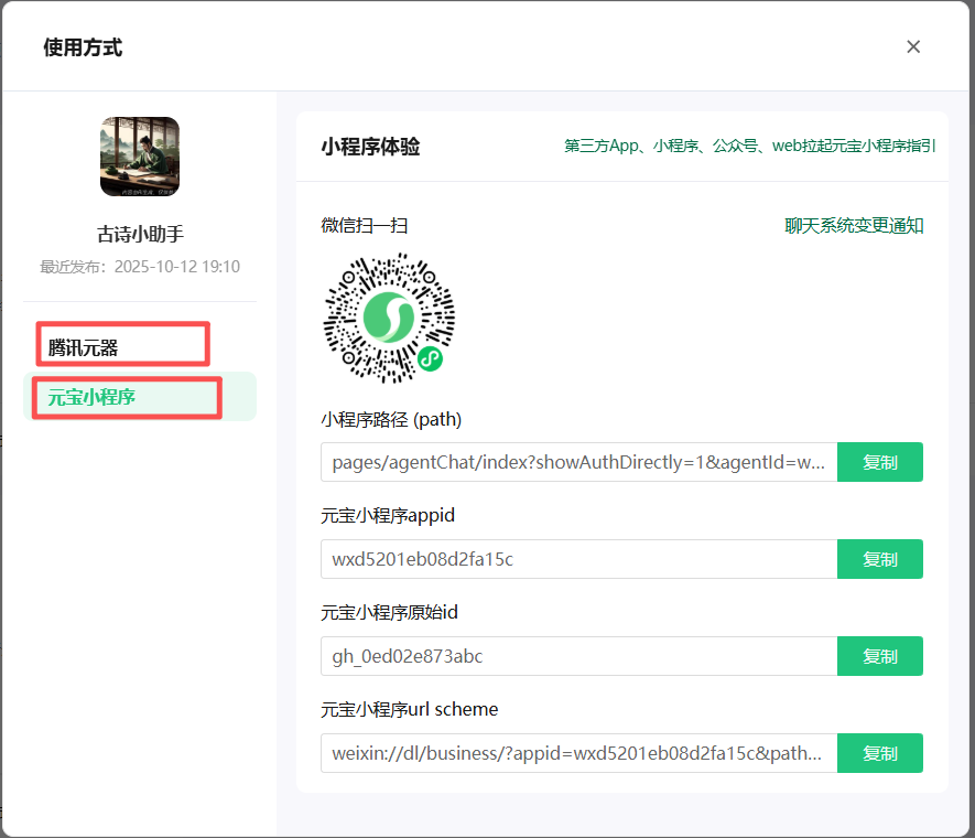 等待我们的古诗小助手发布成功之后,我们可以直接点击【使用方式】来获取智能体的多种使用方式