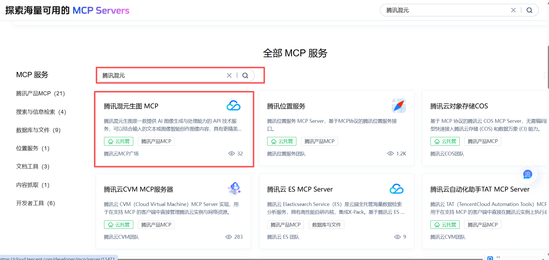 这里我们要介绍的另外一个资源就是腾讯混元生图 MCP ,这里我们打开 MCP 广场:https://cloud.tencent.com/developer/mcp 在搜索框中输入:腾讯混元 找到我们需要的【腾讯混元生图 MCP】