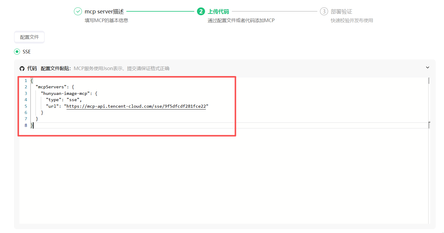 在通过配置文件或者代码添加 MCP Server 的页面我们粘贴我们在 MCP 广场复制的腾讯混元生图 MCP Server 的 SSE 配置内容,然后点击【提交部署】