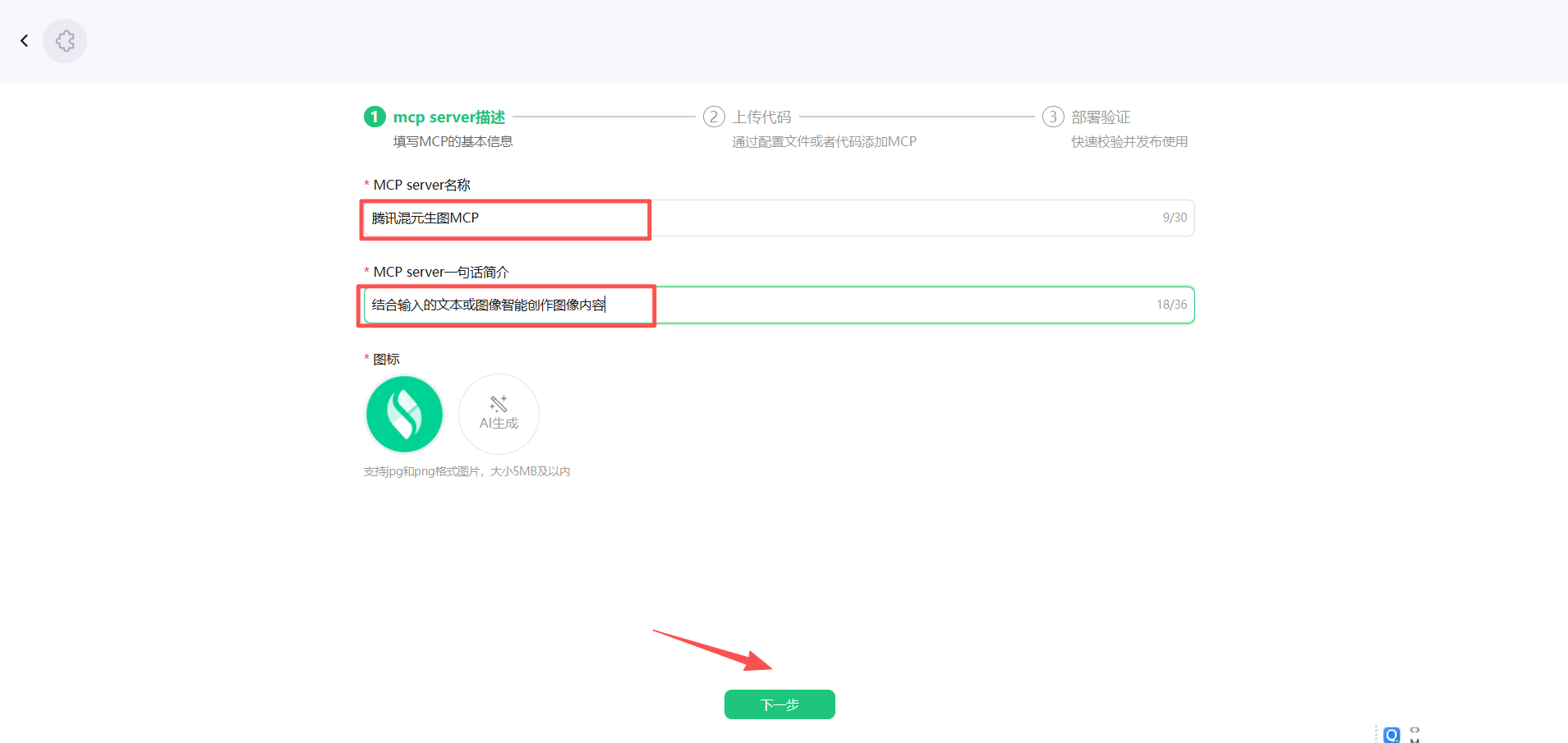 在打开的 MCP 创建页面输入 MCP Server 名称、MCP Server 简介后点击【下一步】