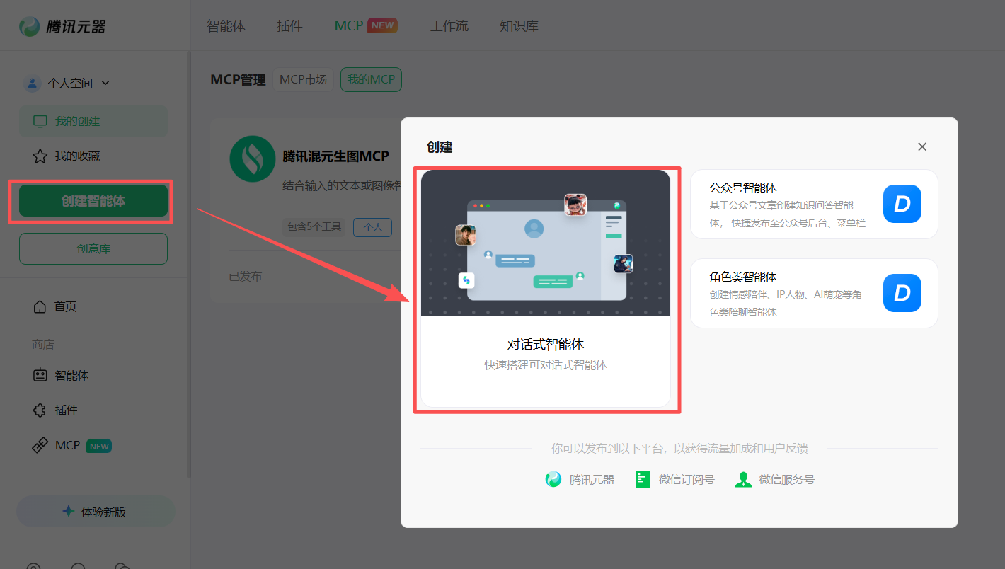 在腾讯元气首页,选择【创建智能体】,在智能体创建页面选择【对话式智能体】