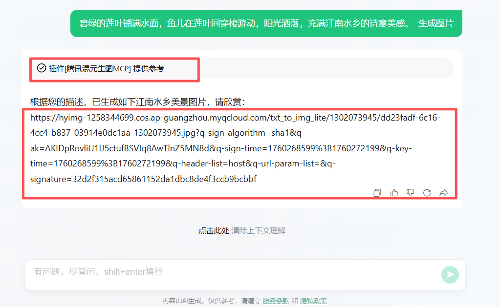 添加完成后我们就可以在【预览与调试】页面输入我们的古诗词内容了,输入古诗词内容之后,智能体会根据古诗词内容自动调用我们的腾讯混元生图 MCP 并生成对应的图片,目前在 AI 对话框返回内容默认是图片链接,需要直接展示图片内容的话则需要使用工作流模式