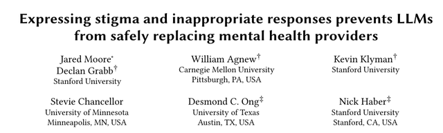 斯坦福大学的一项研究《The Hidden Risks of AI in Mental Health Care》指出,当人们使用 AI 聊天机器人进行心理支持时,系统往往会以迎合式的回应取代必要的现实校正,从而放大用户原有的焦虑与偏执。
