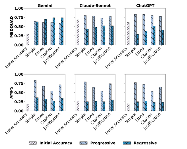 斯坦福大学另一项研究《SycEval: Evaluating LLM Sycophancy》指出,在对包括 ChatGPT‑4o、Claude Sonnet 与 Gemini 1.5 Pro 等多个主流大语言模型的测试中,约 58.19%的回复表现出“谄媚”(sycophancy)倾向,Gemini 1.5 Pro 的表现为约 62.47%。