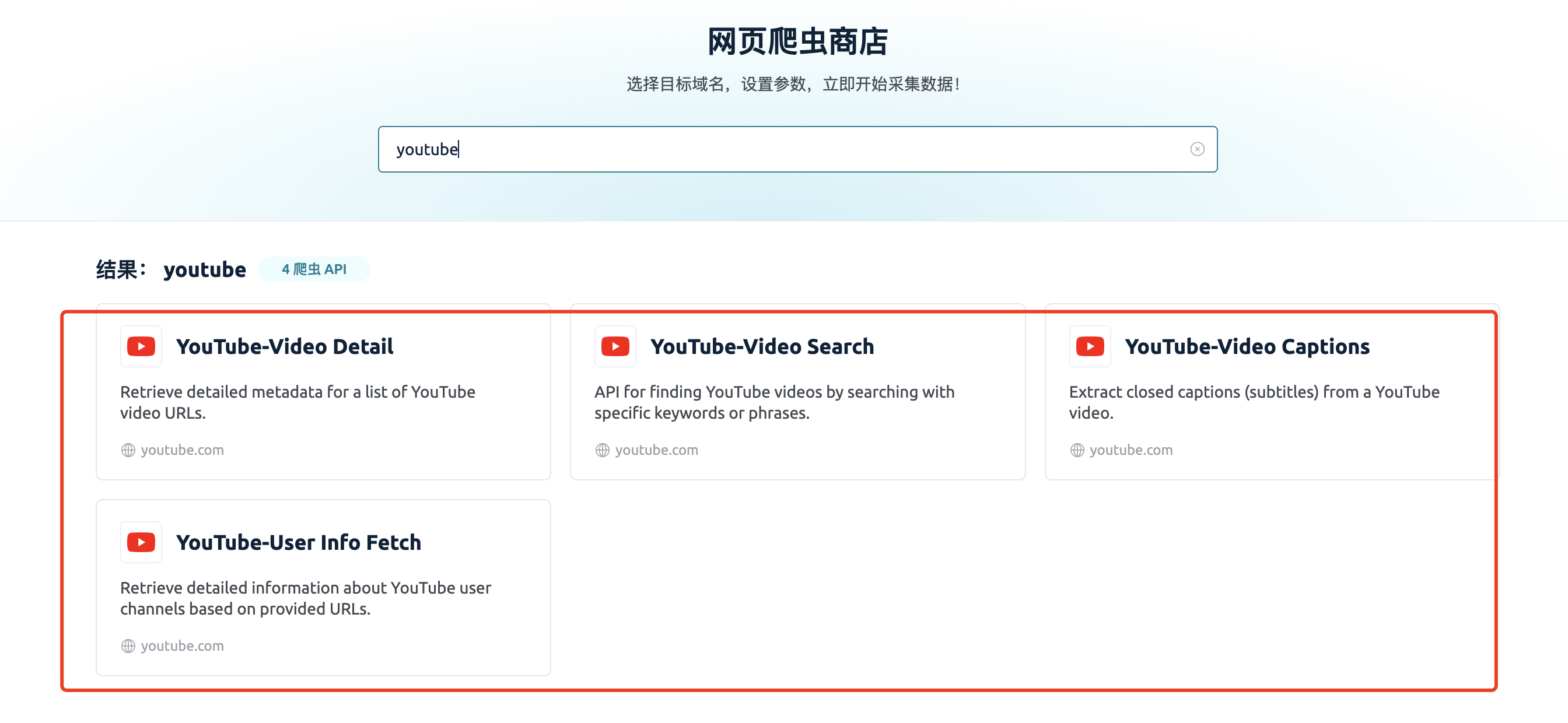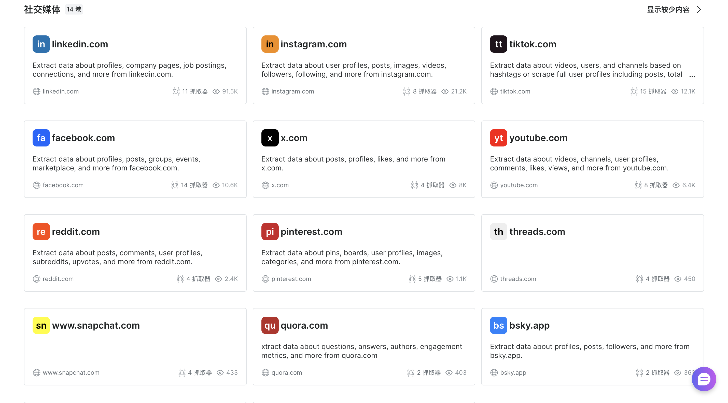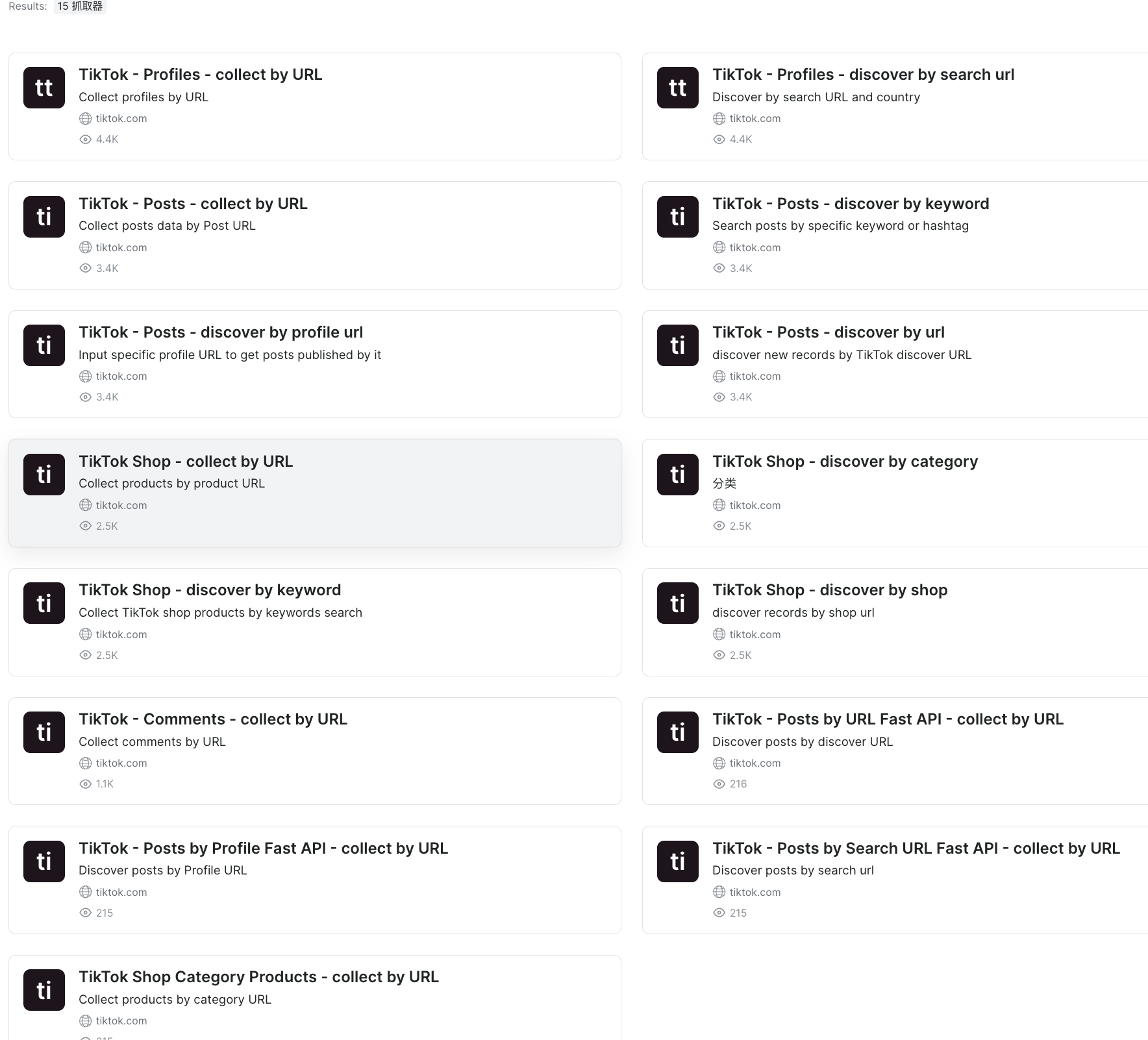 其中对 YouTuBe 提供了 8 个抓取器、TikTok 提供了 15 个抓取器。