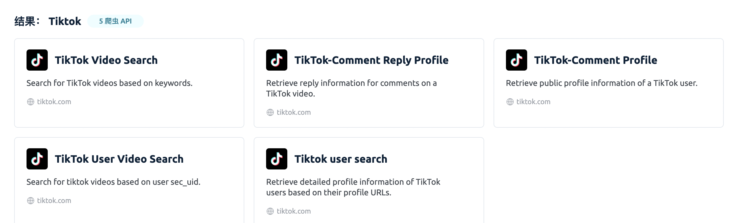 可以看到 tiktok 的 API 非常丰富,支持 15 个抓取器。