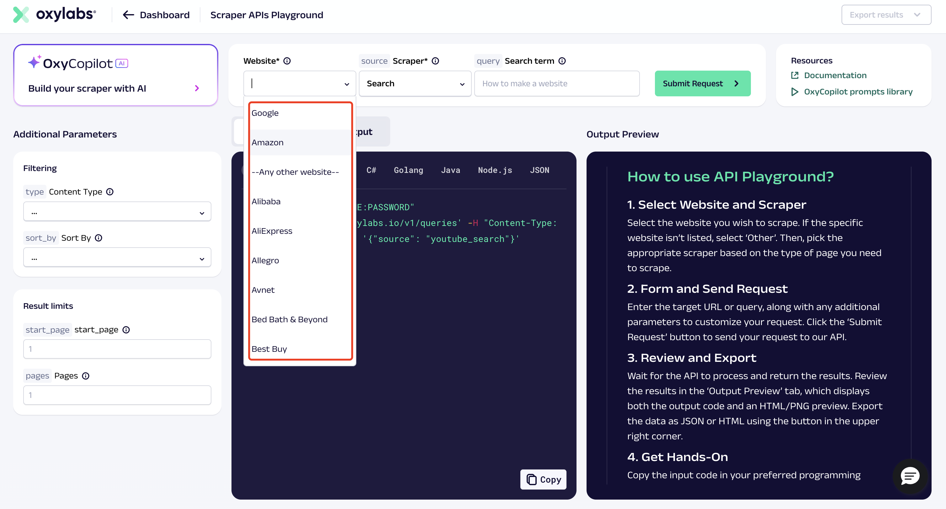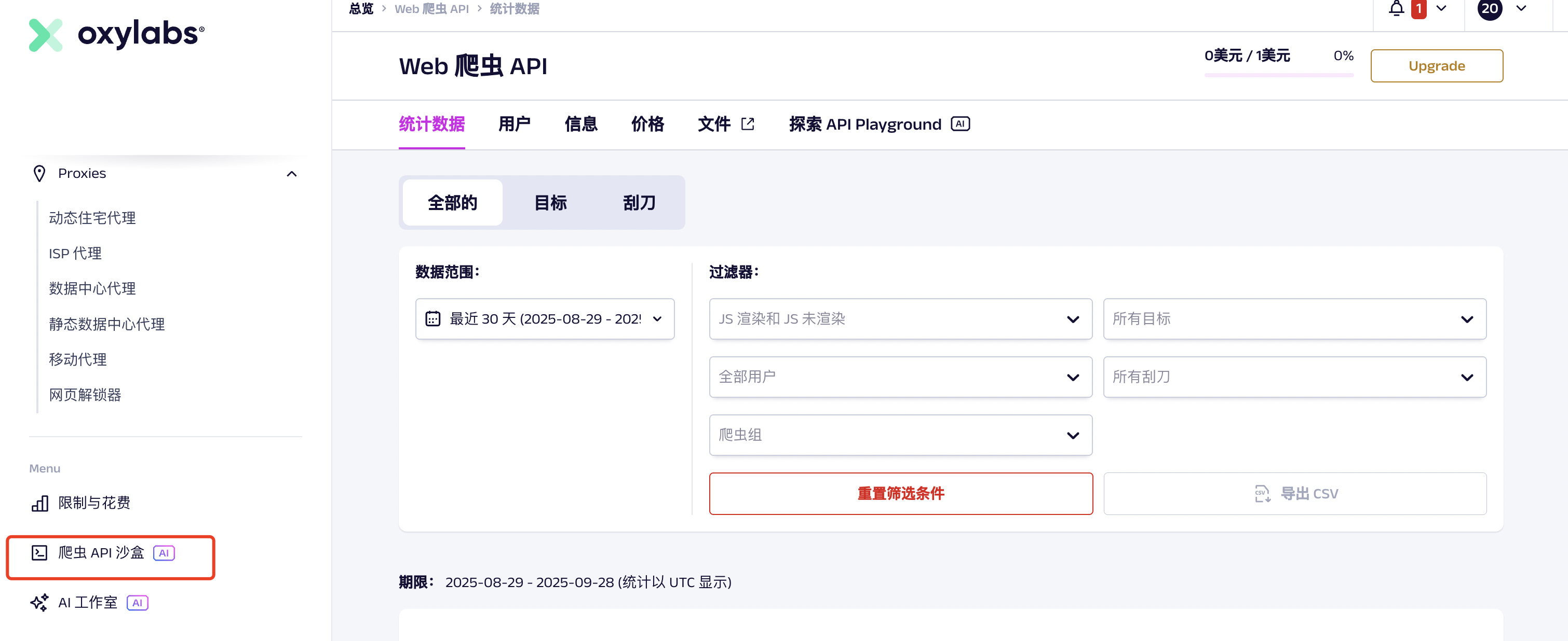 首先登录到 Oxylabs 平台,点击左侧菜单中的“爬取 API 沙盒”