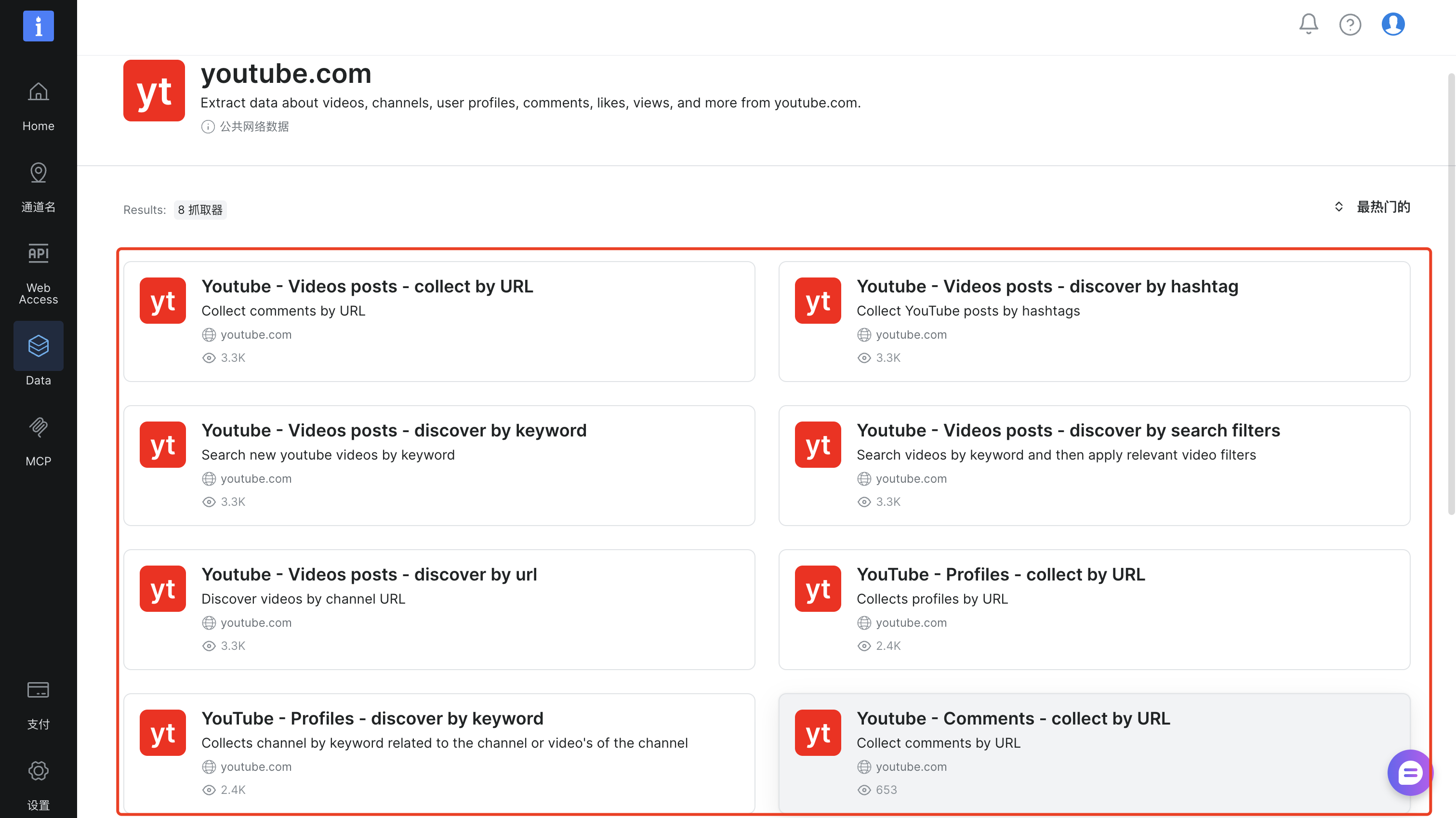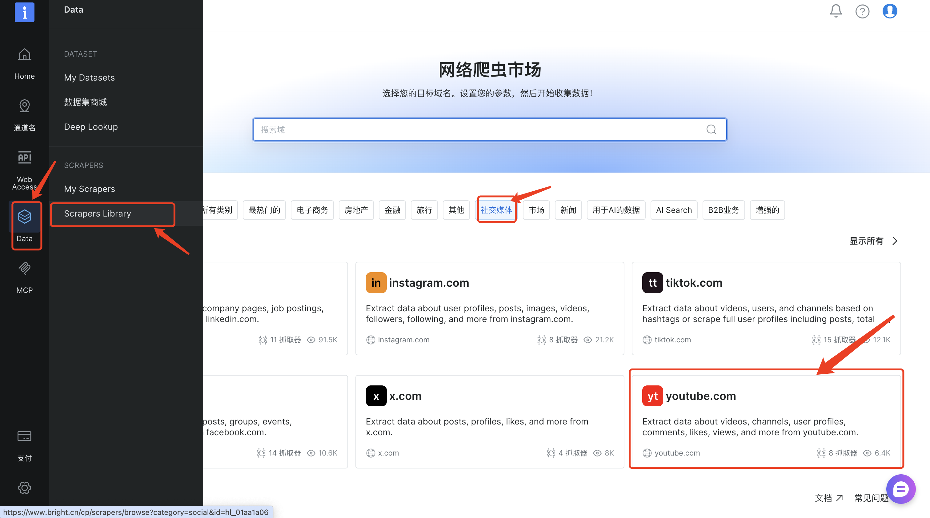 登录到Bright Data用户控制面板之后,选择左侧菜单“Data”中的“Scrapers Library”,然后选择分类中的“社交媒体”,选择下面的“youtube.com”