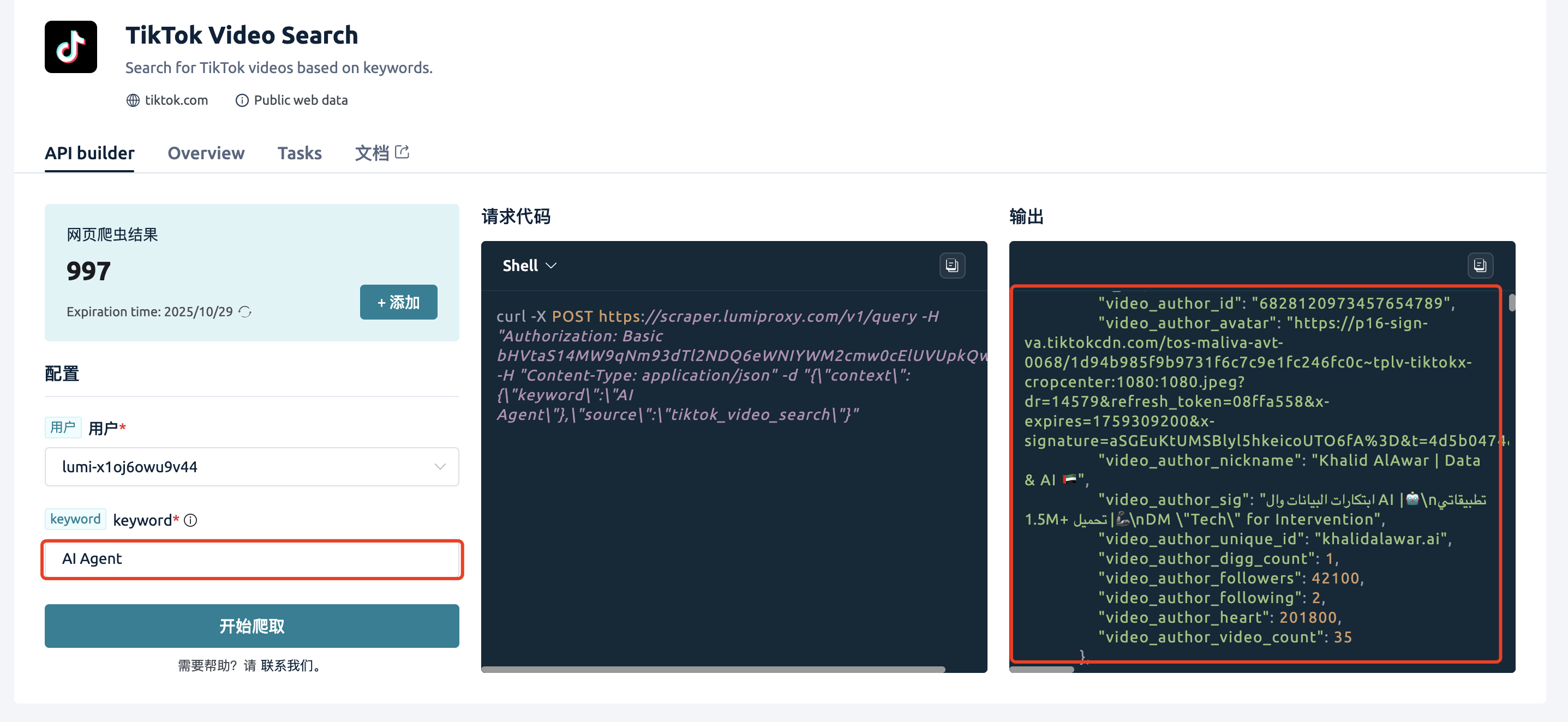 基于关键词搜索 TikTok 视频,输入:AI Agent