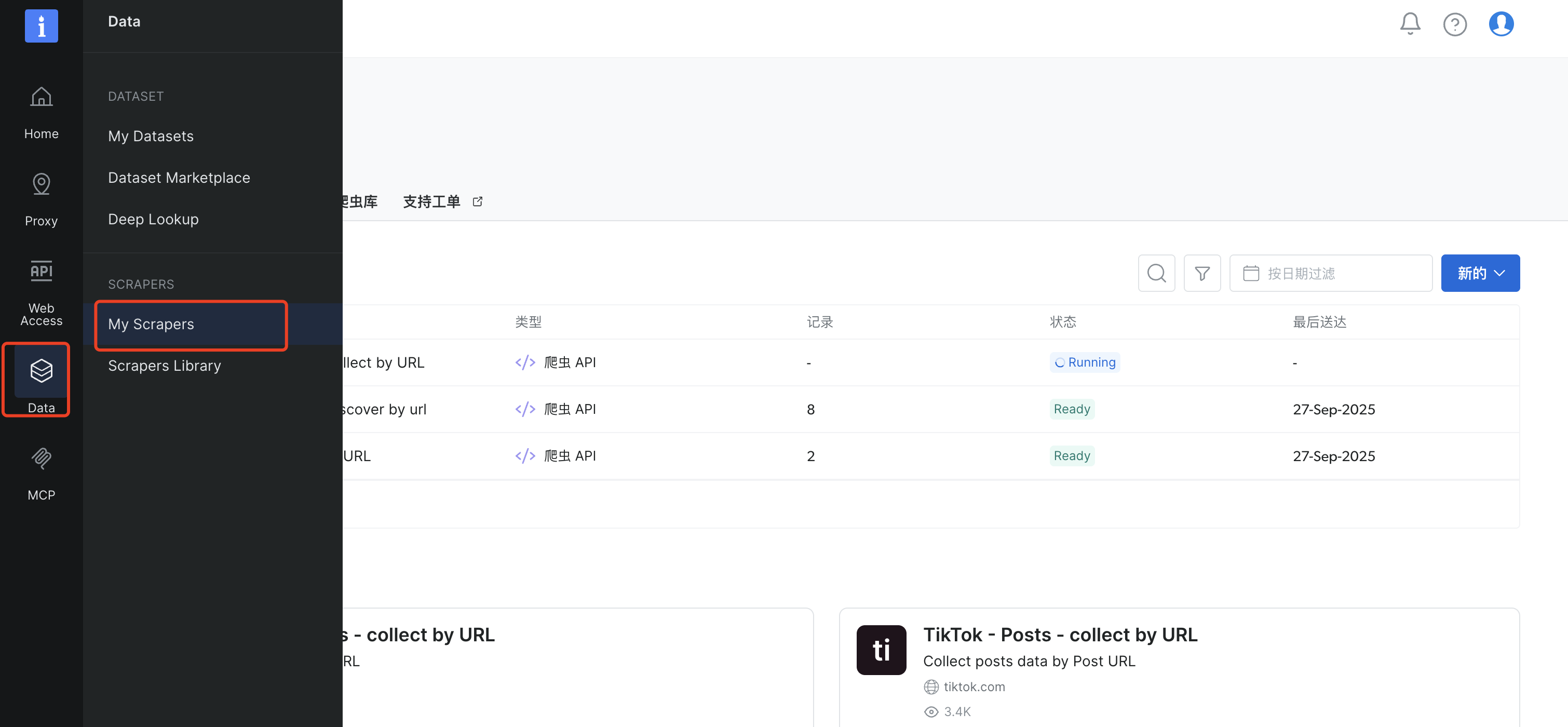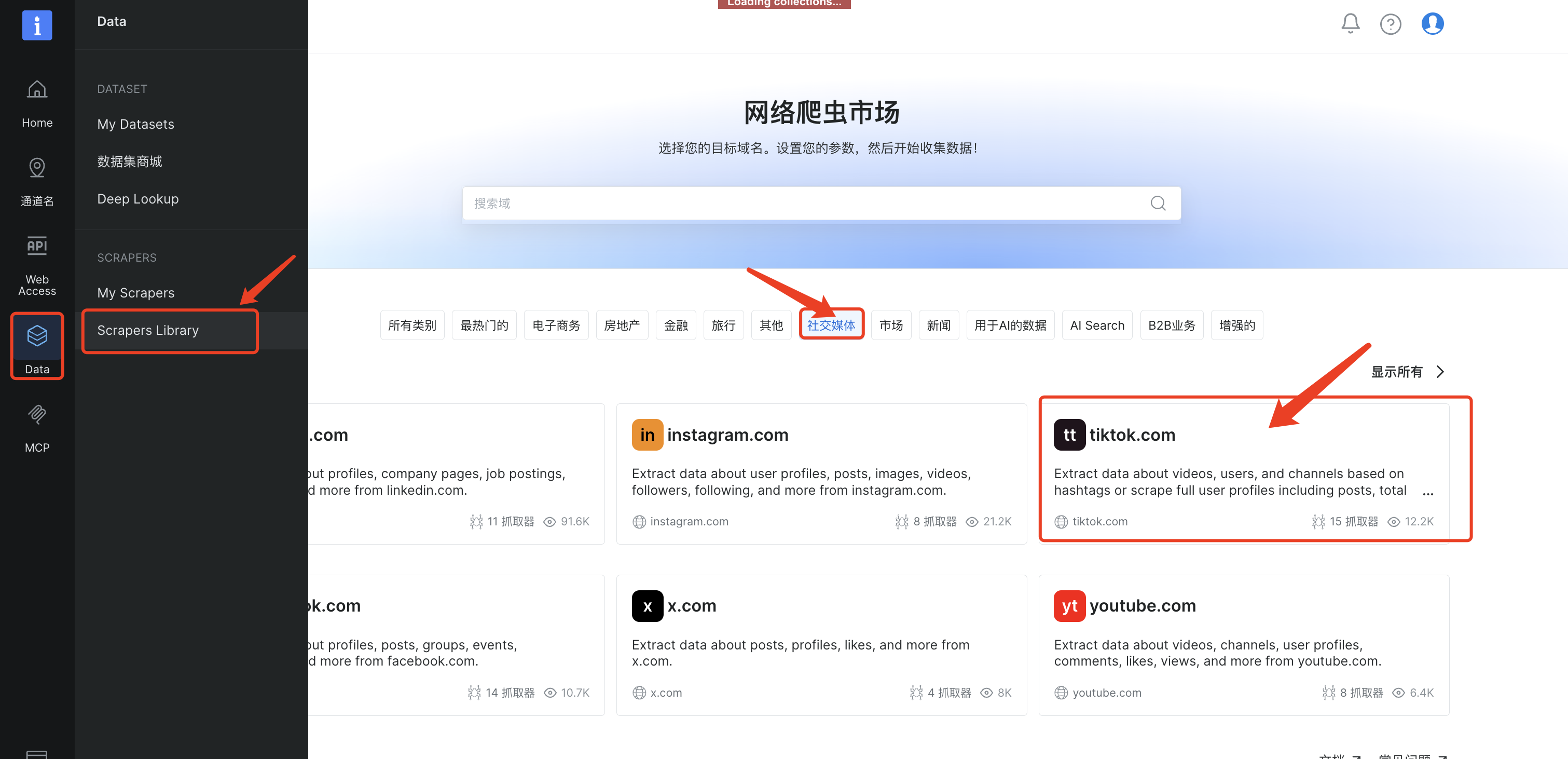 登录到 Bright Data 用户控制面板之后,选择左侧菜单“Data”中的“Scrapers Library”,然后选择分类中的“社交媒体”,选择下面的“tiktok.com”