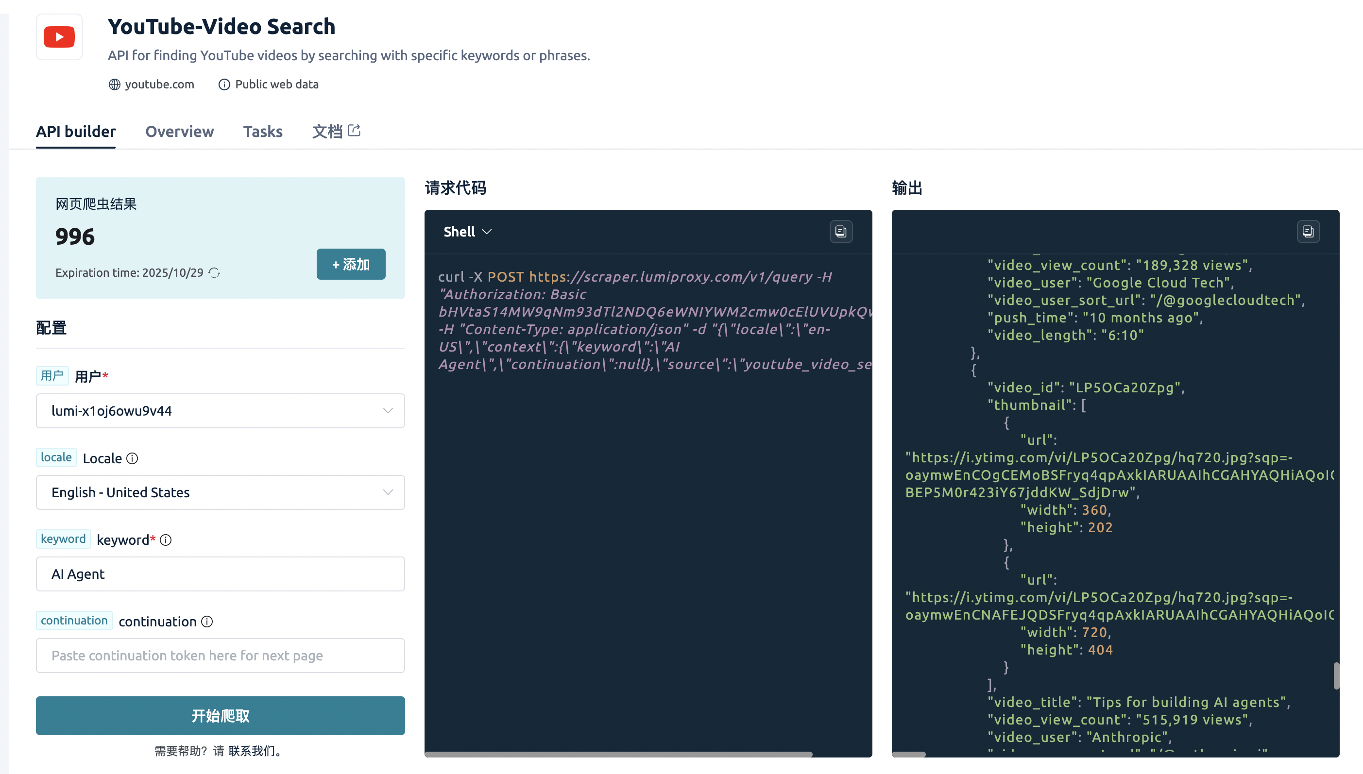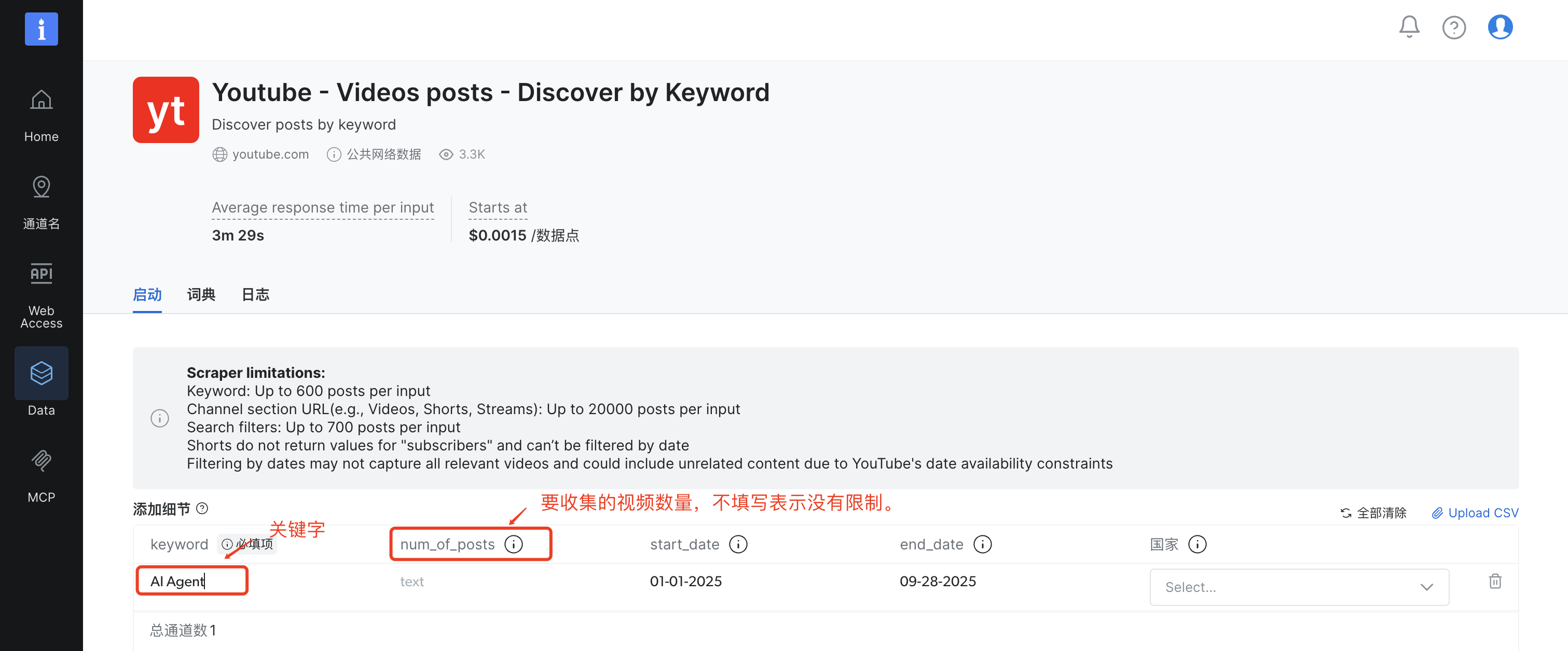 通过关键词搜索新的 YouTube 视频帖子,输入关键字:AI Agent,,要求不限制页数爬取