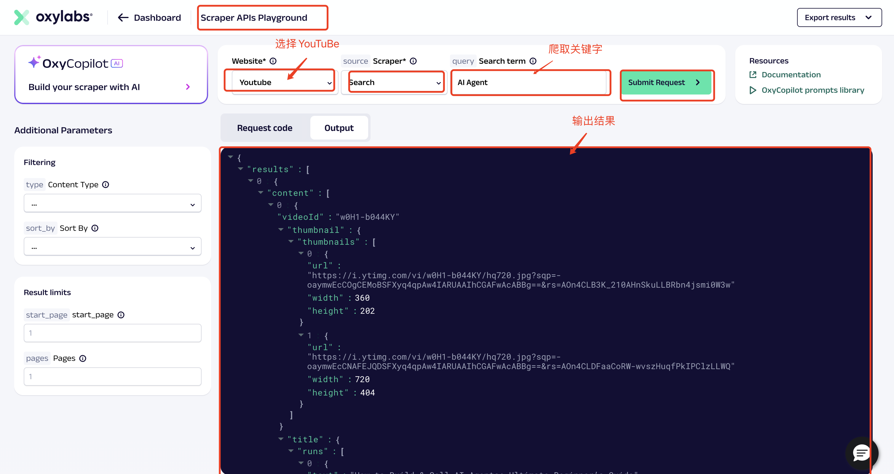 然后在面板中的 Website 选择“YouToBe”,Scarper 选择“Search”,Search term 输入:AI Agent,随后点击“Submit Request”,结构直接输出在下面的“Output”标签页