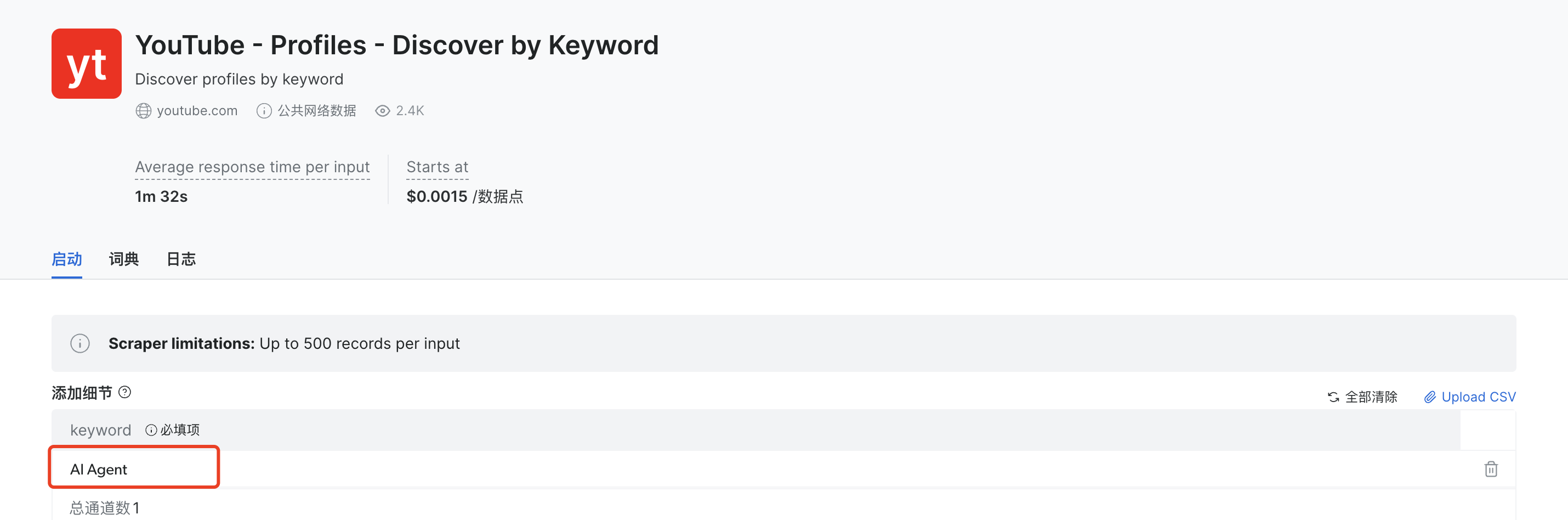 通过与频道或视频相关的关键词收集频道资料,输入 keyword:AI Agent