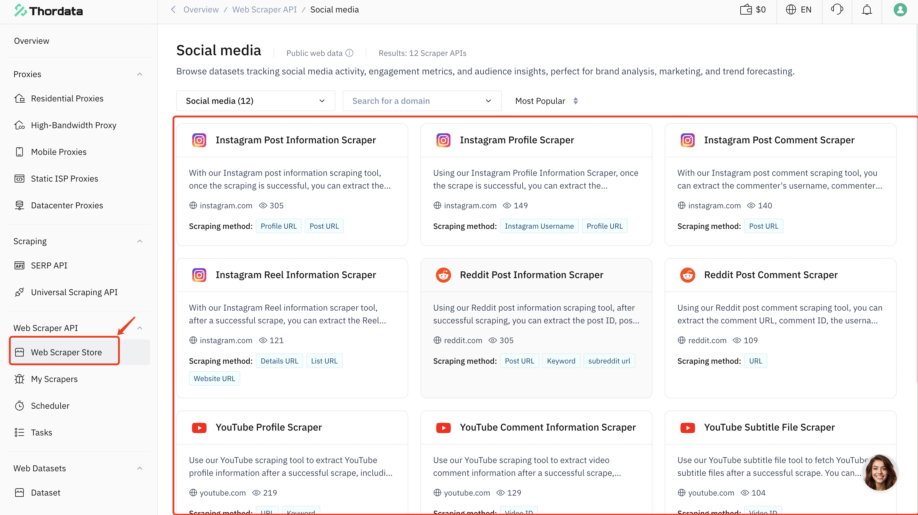ThorData 是新兴厂商,主打灵活性与性价比。支持爬取 7 个常见网站,其中包括 YouTuBe、Instagram、Reddit 三个社交媒体网站。